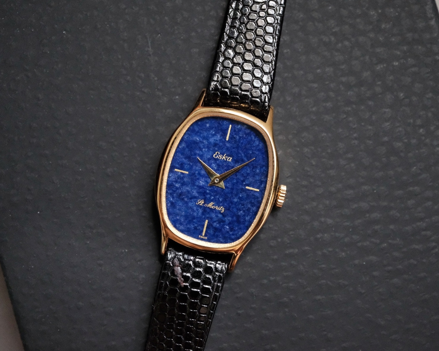 NOS! Vintage Eska St. Moritz Mini Ellipse Gold-Plated Ladies Watch with Lapis Lazuli Dial Manual Wind Watch – Swiss Made