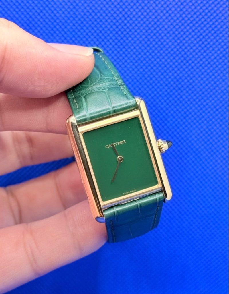 Pre Owned 10/2023 Cartier Tank Louis Cartier Watch Green Dial Full Yellow Gold Alligator Strap WGTA0191